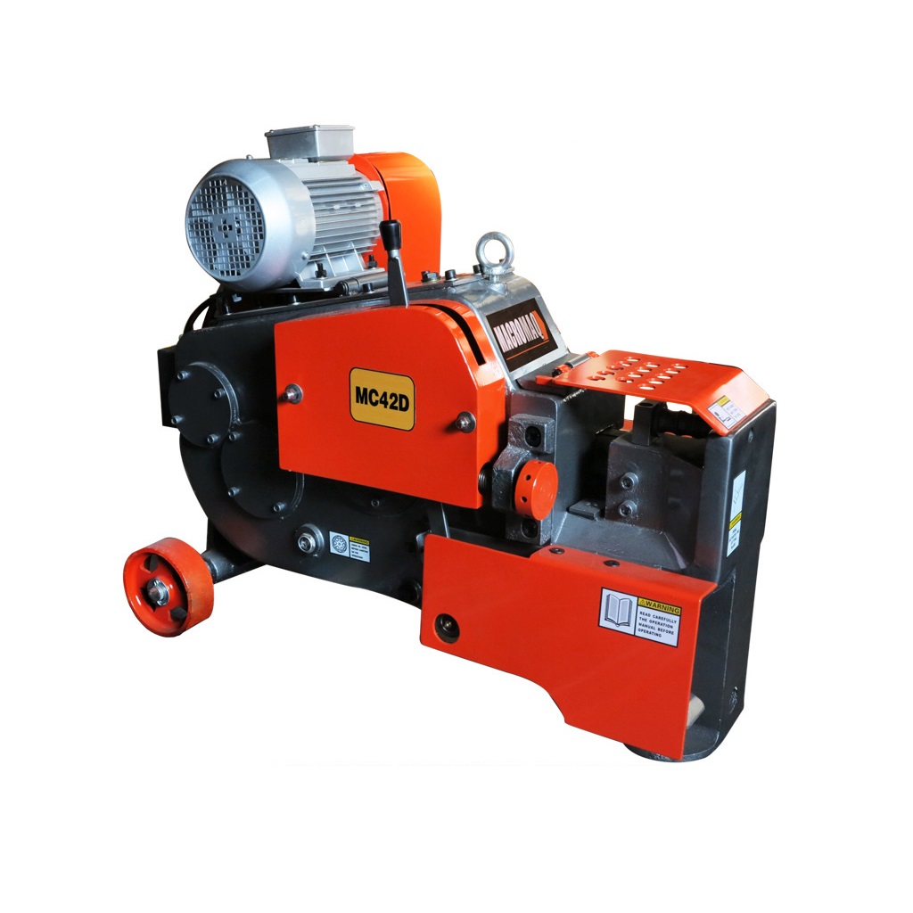 MODELO MC- 42D: Con motor trifasico de 4HP. – 48 cortes consecutivos por minuto. Sistema mecanico de seguridad, que bloquea y protege las laminas cortadoras durante la operacion. Caja de engranjes en bano de aceite. Peso total 495 Kgs. Parametros de corte: Hierro 32″mm= 1 varilla, 25″mm= 2 varillas, 18″mm= 3 varillas, 14″mm= 4 varillas.